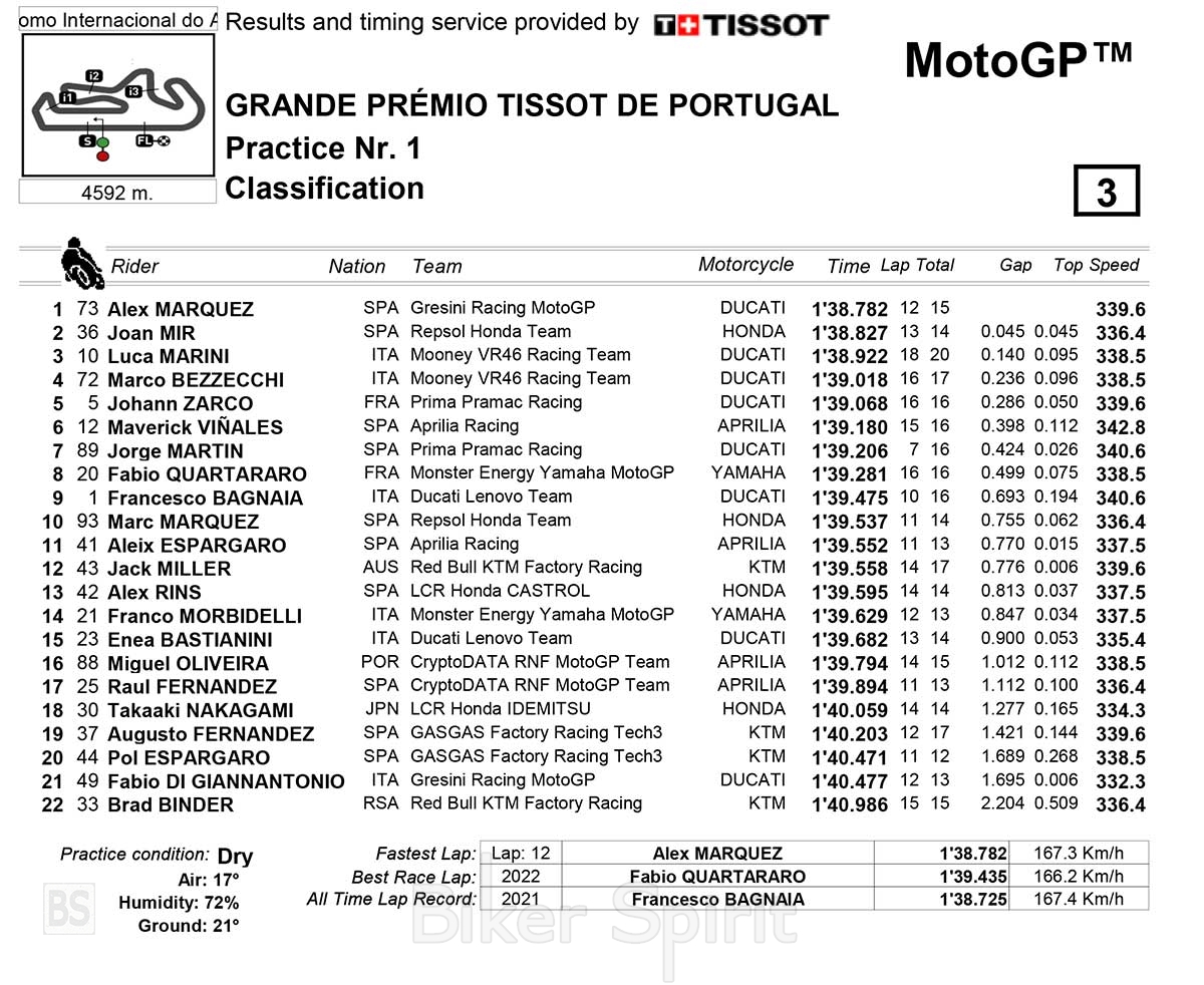 Ο Jorge Martin τέλειωσε το P1 στην 7η θέση, μπροστά από το πρώτο Yamaha με τον Fabio Quartararo και τον Παγκόσμιο Πρωταθλητή 2022, Pecco Bagnaia, ενώ την πρώτη δεκάδα έκλεισε ο Marc Marquez με 0.755s διαφορά από τον αδερφό του στην κορυφη!