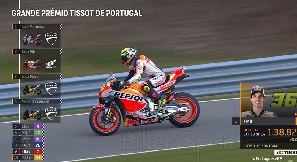 Στην 2η θέση ο Joan Mir με την νέα του μοτοσυκλέτα και την νέα του ομάδα – Repsol Team Honda Factory – και αυτός, φέρνοντας την πρώτη Honda στην κορυφη με χρόνο 1.38.827, και διαφορά μόλις 0.045s.