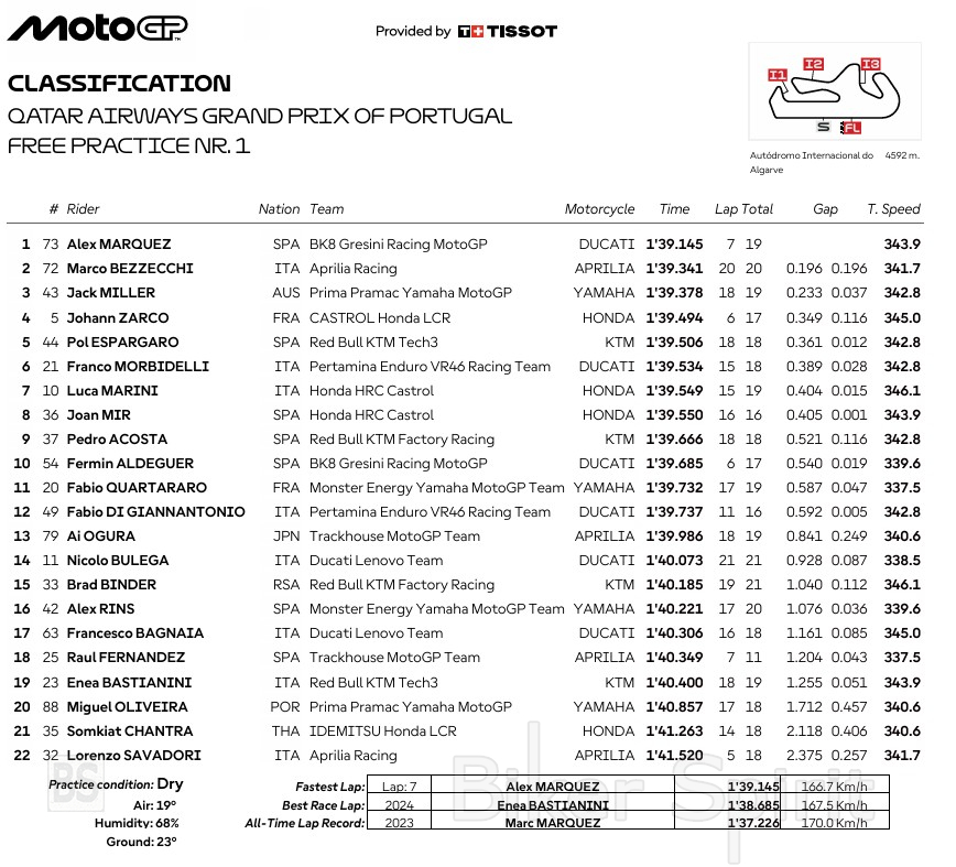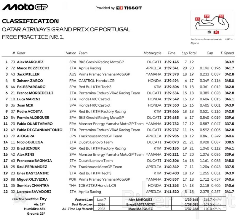 Ο Marco Bezzecchi ήταν μόλις 0.196s πίσω του, με μια πολύ δυνατή εμφάνιση στα τελευταία λεπτά των πρώτων ελεύθερων δοκιμαστικών, δείχνοντας ότι η RS-GP αποδίδει εξαιρετικά στο τεχνικό και απαιτητικό Portimao. Ο Jack Miller με την Pramac Yamaha ολοκλήρωσε την πρώτη τριάδα, τερματίζοντας 0.233s από την κορυφή.