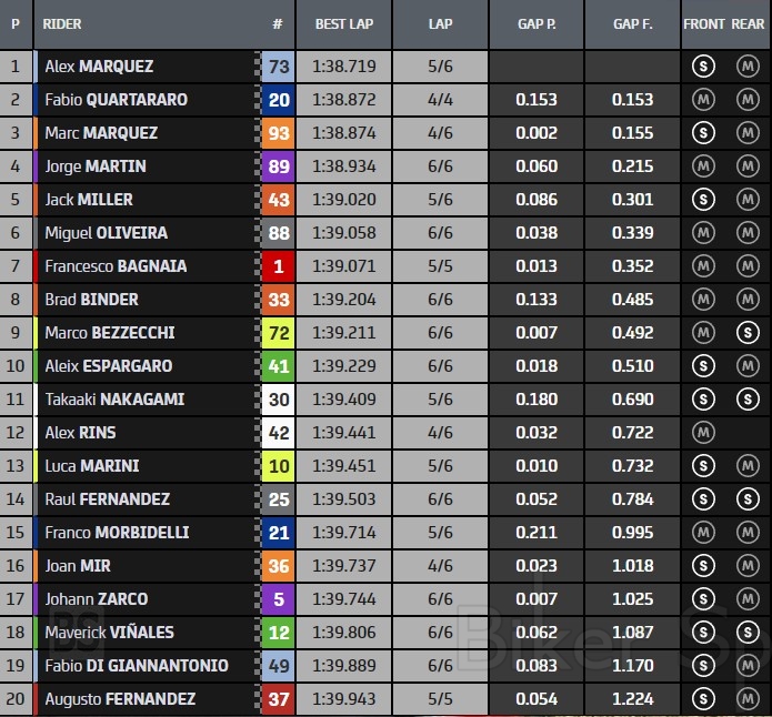 Στην 7η θέση ήταν ο Παγκόσμιος Πρωταθλητής Pecco Bagnaia, μπροστά από τους Brand Binder, Marco Bezzecchi και Aleix Espargaro που έκλεισαν την κορυφαία 10αδα του πρωινού ζεστάματος.