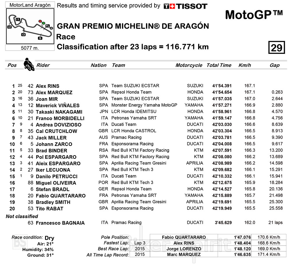 Στην 13η θέση τερμάτισε το πρώτο Aprilia με τον Alex Espargaro, μπροστά από το ΚΤΜ του Lecuona και το Ducati του Petrucci που έκλεισε την 15αδα που παίρνει βαθμούς!