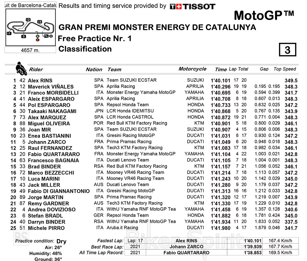 Ο Alex Rins ταχύτερος του FP1 στην Catalunya – Αποτελέσματα – Suzuki, Aprilia, Yamaha και Honda στο TOP 5