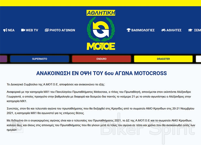 Αναφορικά με την κατηγορία ΜΧ1 του Πανελληνίου Πρωταθλήματος Motocross, ο τίτλος του Πρωταθλητή, απονέμεται στον εκλιπόντα Αλέξανδρο Γεωργαντά, ο οποίος προηγείτο στην βαθμολογία με διαφορά και δεσμεύει δια παντός το νούμερο 21 με το οποίο αγωνίστηκε ο Αλέξανδρος στην κατηγορία ΜΧ1.