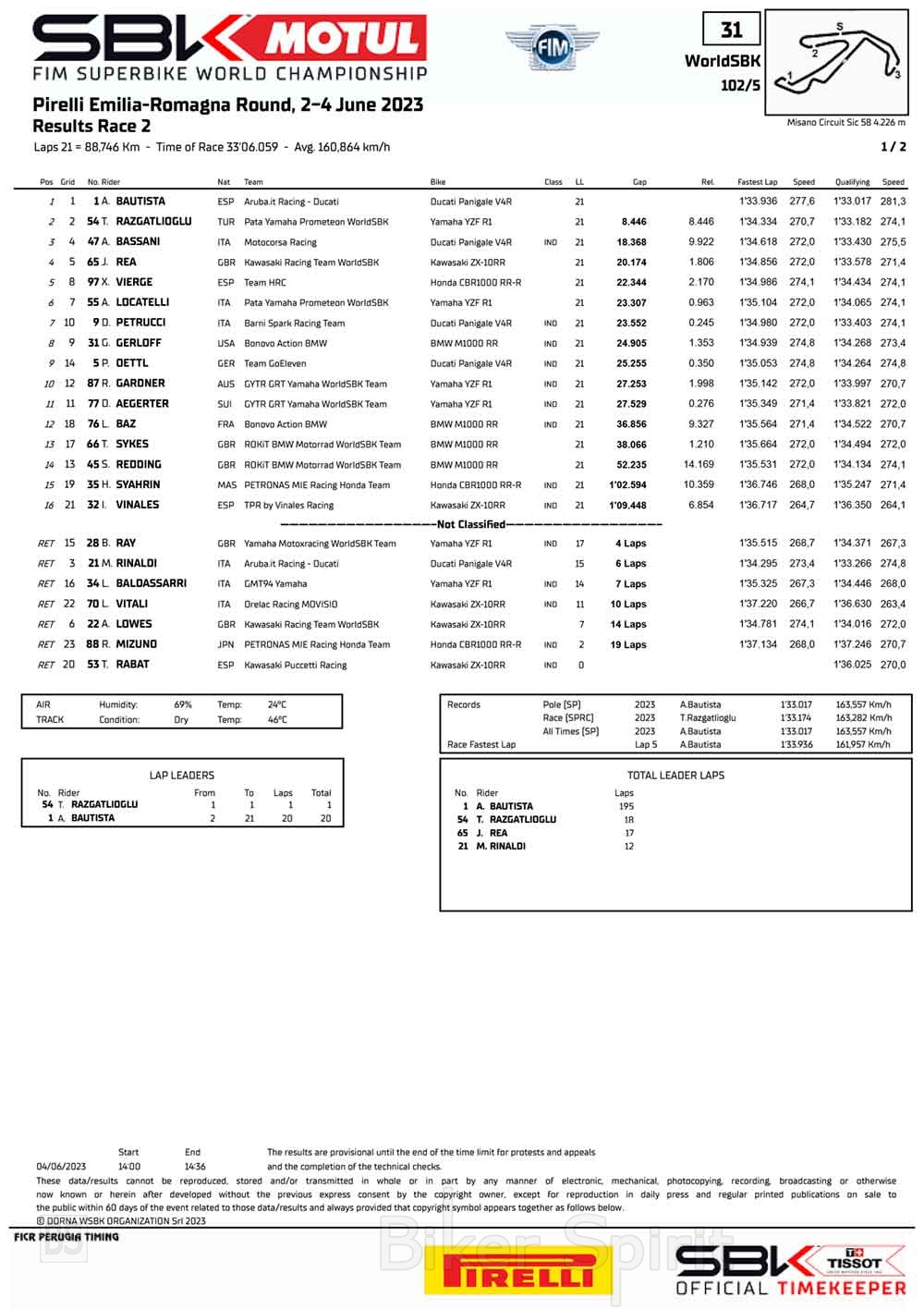 Ο Razgatlioglu είναι τώρα ακόμα πιο κοντά στα 100 βάθρα, με 96, ενώ είναι επίσης το καλύτερο σερί βάθρων της Yamaha σε 15 αγώνες. Ο Bassani κατέκτησε το πέμπτο του βάθρο στο WorldSBK, το πρώτο του μετά το Σαν Χουάν πέρυσι.
