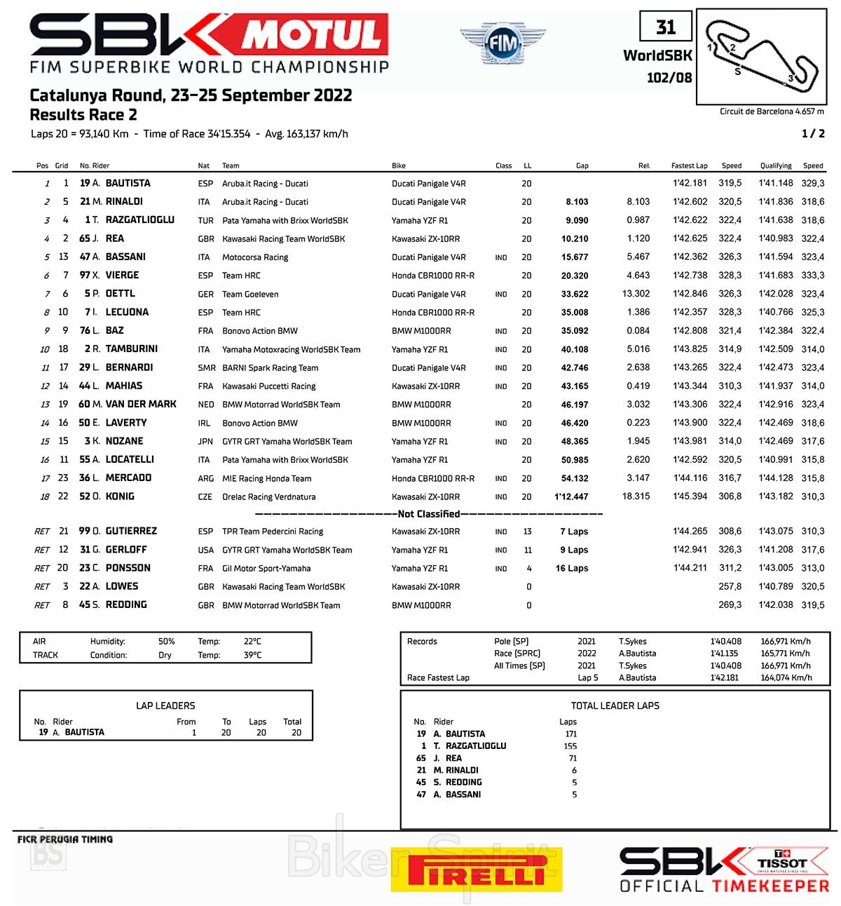 Απόλυτη κυριαρχία του Alvaro Bautista στην Catalunya, όπου κέρδισε και τον 2ο αγώνα κάνοντας hat-trick. Rinaldi και Razgatlioglu στο βάθρο, ο Rea 4ος – Αποτελέσματα