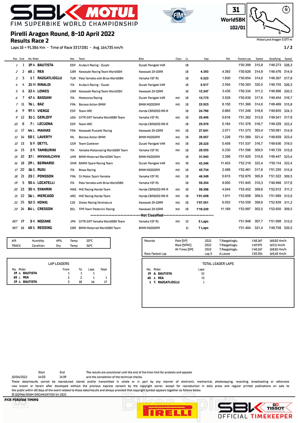 Αυτή ήταν 2η νίκη του 1ου γύρου μετα την πρωινή νίκη στον αγώνα Superpole και έτσι φεύγει από το Aragon επικεφαλής της βαθμολογίας για πρώτη φορά μετά τον Misano το 2019, με διαφορά 1022 ημερών, καθώς κέρδισε την 18η νίκη στην καριέρα του στο WorldSBK, με 57 βαθμούς, έναντι των 54 του δευτέρου Jonathan Rea! .