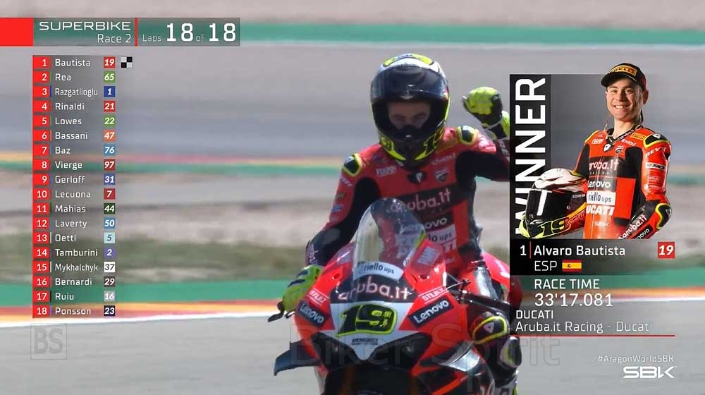 Ο πρώτος γύρος του Παγκόσμιου Πρωταθλήματος WorldSBK FIM 2022 ολοκληρώθηκε με έναν ακόμη συναρπαστικό αγώνα στο MotorLand Aragon για τον Γύρο Pirelli Aragon, με τον Ισπανό αναβάτη της Ducati, Alvaro Bautista να παίρνει την νίκη του 2ου αγώνα, με διαφορά 4.393s από τον δεύτερο!