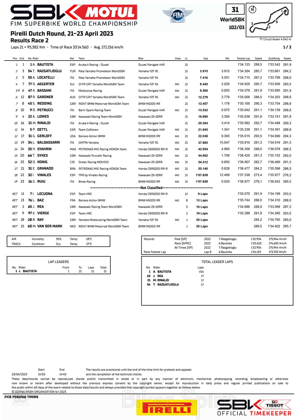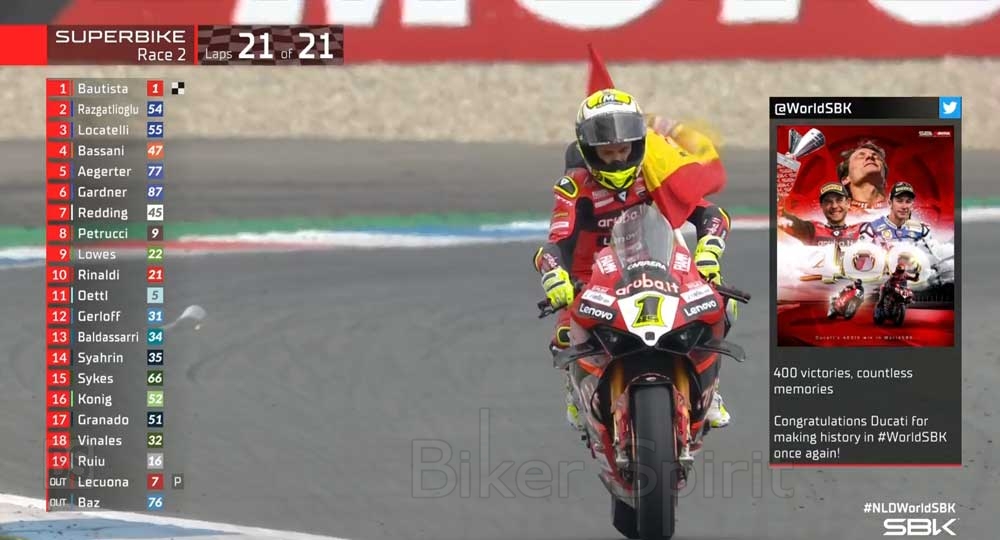 Ο Alvaro Bautista (Aruba.it Racing – Ducati), εκτός τις τρεις νίκες στο Assen κάνοντας ένα ακόμα Χατ-τρικ, χάρισε στην Ducati την 400η της νίκη στο WSBK
