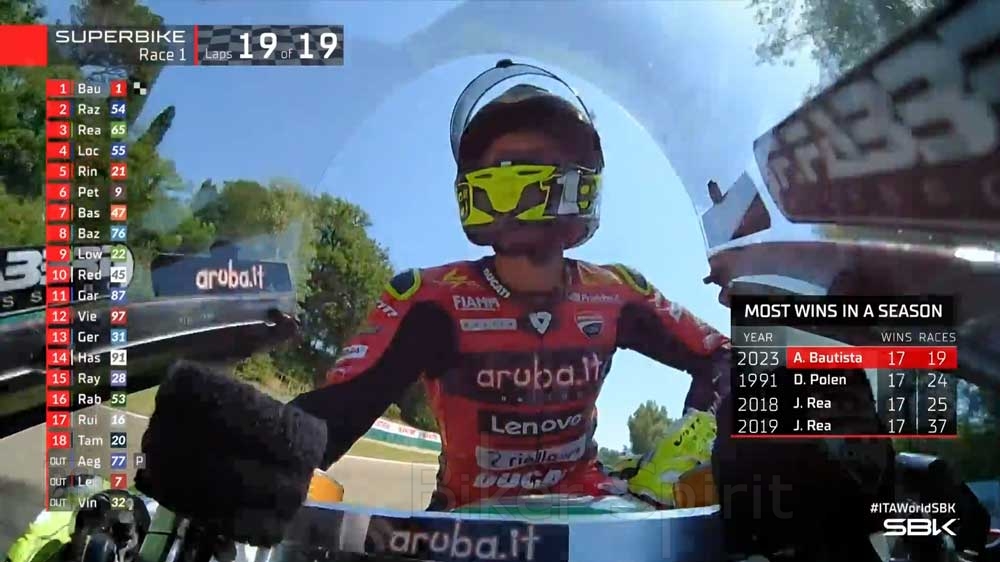 Αλλα τελικά ο Bautista ασυγκράτητος για άλλη μια φορά κατάφερε και πέρασε τον Razgatlioglu οκτώ γύρους από το τέλος, παίρνοντας το προβάδισμα του αγώνα και φτιάχνοντας ένα μεγάλο κενό από τους διώκτες του γύρο με τον γύρο. Παρά τις υψηλές θερμοκρασίες, ο Ισπανός διατήρησε έναν απίστευτο ρυθμό που τον οδήγησε να πάρει την 17η νίκη του στη σεζόν, ένα ρεκόρ που ισοβάθμησε με το κορυφαίο ρεκόρ νικών σε μια σεζόν.