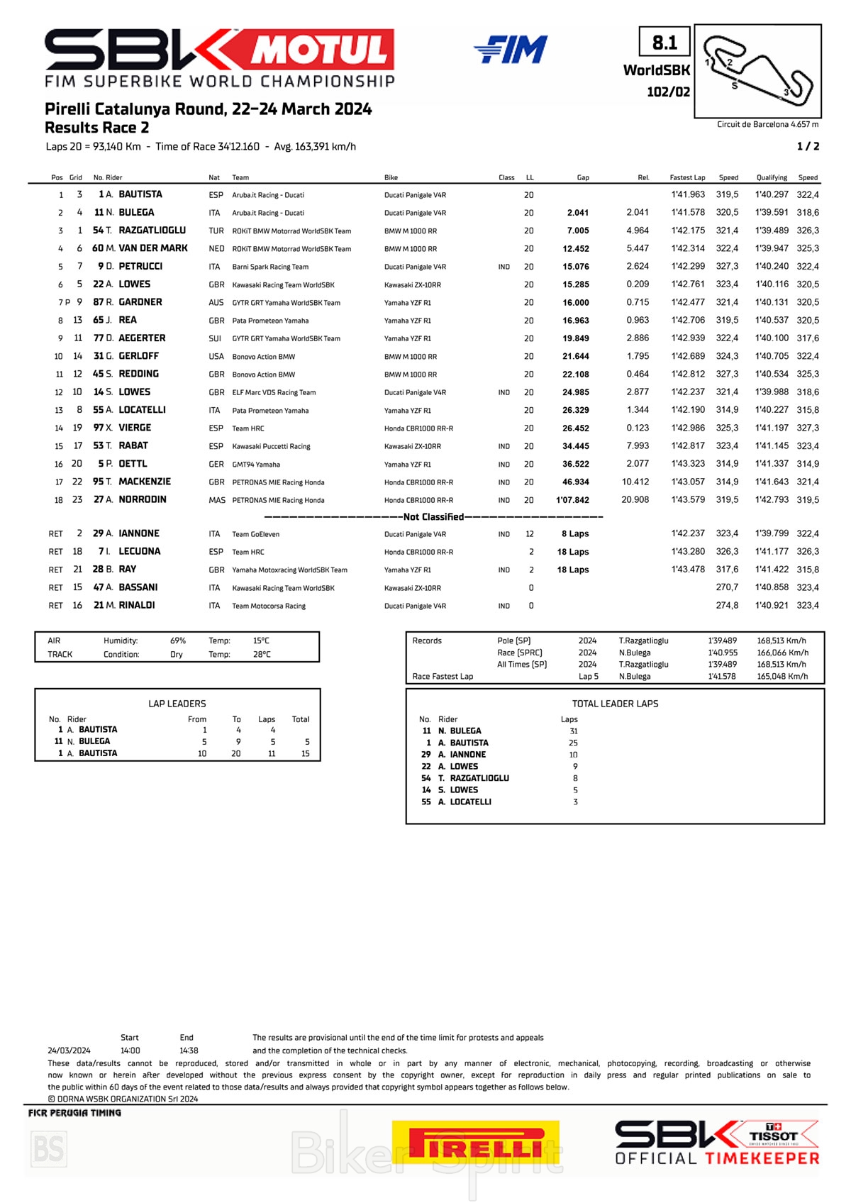 Στη δεύτερη θέση, τερμάτισε ο Bulega και διατηρεί την ηγεσία του στο παγκόσμιο πρωτάθλημα. Το βάθρο έκλεισε στην 3η θέση ο πρωταγωνιστής του Σαββατοκύριακου Toprak Razgatlioglu, που ήταν πολύ γρήγορος και ανταγωνιστικός στα πρώτα στάδια, αλλά στη συνέχεια αναγκάστηκε να αρκεστεί στην 3η θέση.