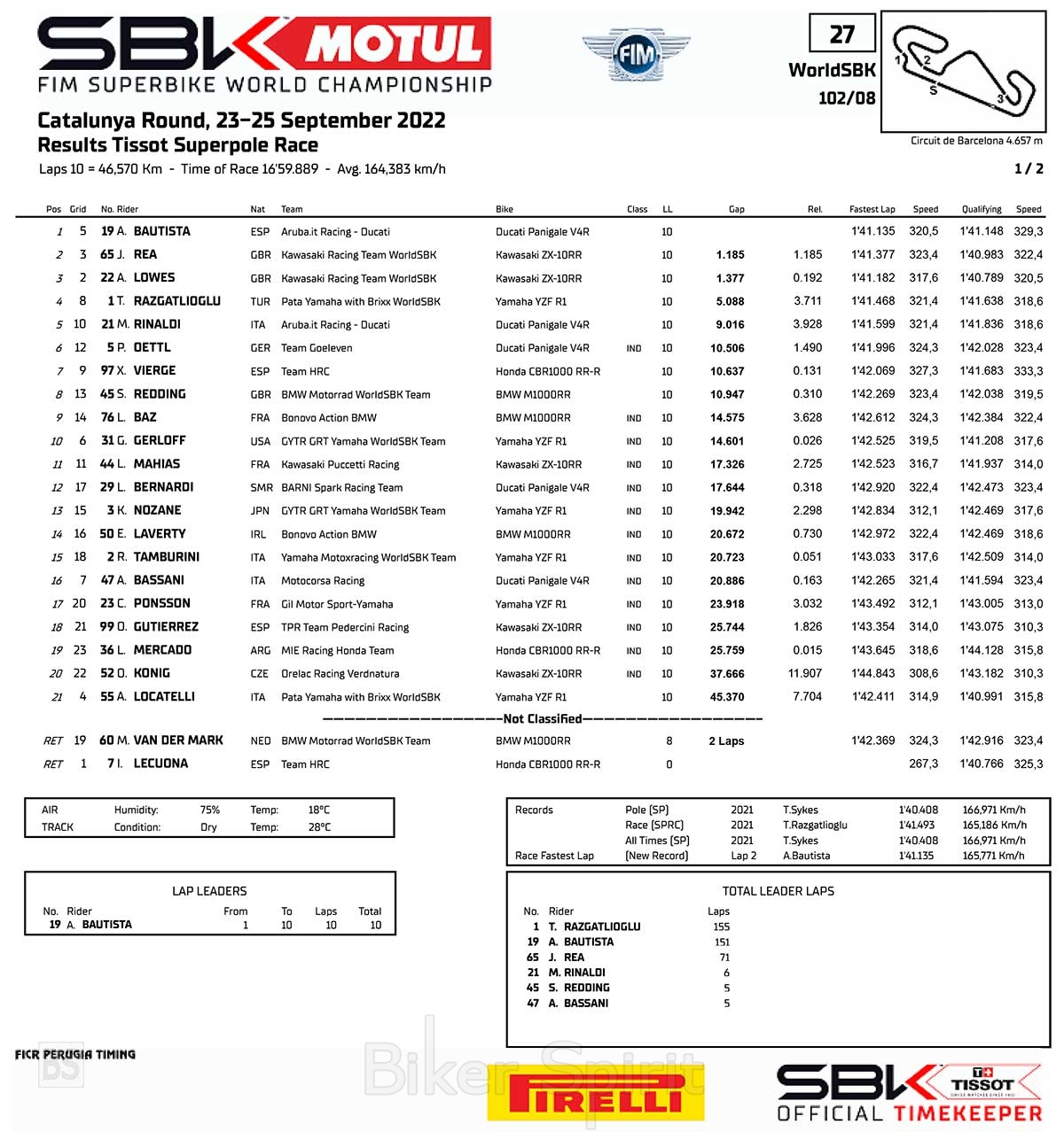 Ο Alvaro Bautista ξεκινώντας από την 2η σειρά και από την 5η θέση, έκανε και πάλι μια εκπληκτική εκκίνηση και εκμεταλλευόμενος την δύναμη της Ducati Panigale έστριψε πρώτος και μπήκε στην κορυφη και έμεινε εκεί μέχρι την καρό σημαία μετα από 10 γύρους του Sprint Race Superpole που θα καθορίσει και την σειρά εκκίνησης του 2ου αγώνα που θα γίνει αργότερα το μεσημέρι!