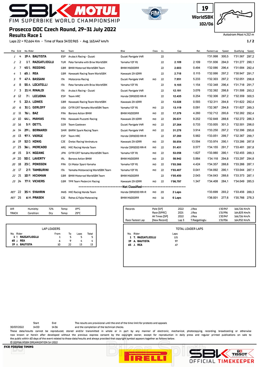 Την κορυφαία εξάδα έκλεισε ο Locatelli, μπροστά από τους Rinaldi, Lecuona με το πρώτο Honda, Alex Lowes και τον Gerloff, που έκλεισε την πρώτη δεκάδα του 1ου αγώνα WSBK στο Most της Τσεχίας!