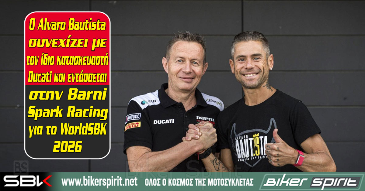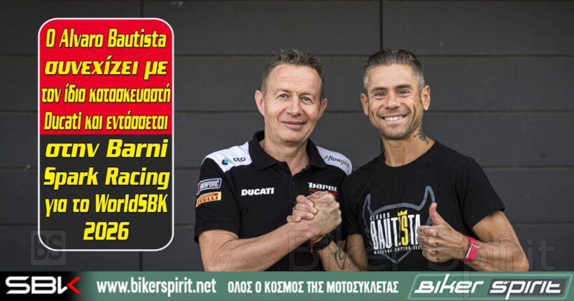 Ο Alvaro Bautista συνεχίζει με τον ίδιο κατασκευαστή Ducati και εντάσσεται στην Barni Spark Racing για το WorldSBK 2026