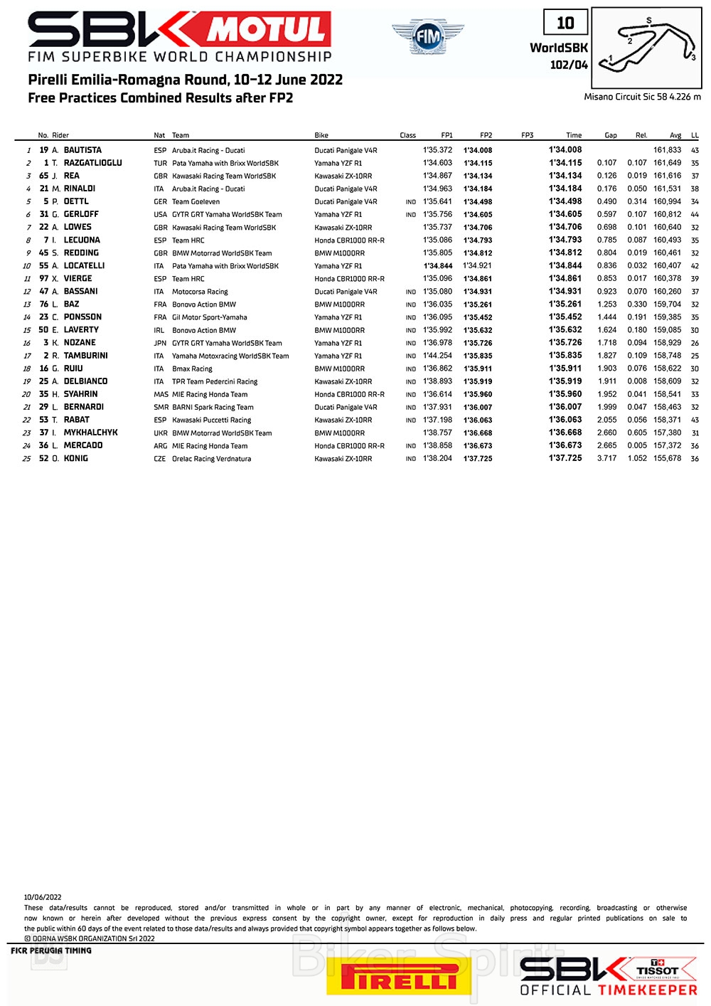 Στον FP1 σήμερα το πρωί, ο Toprak Razgatlioglu (Yamaha) σημείωσε τον ταχύτερο χρόνο με 1:34.603, ενώ το απόγευμα στο FP2 τον ταχύτερο χρόνο έκανε ο Alvaro Bautista με 1:34.008.