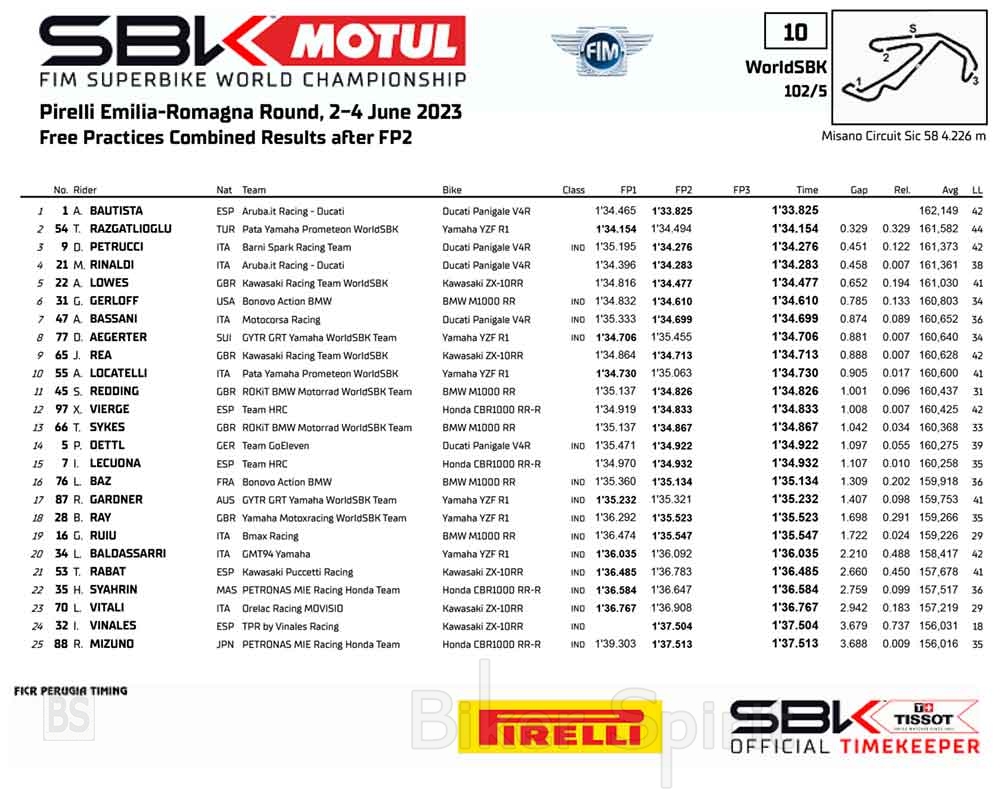 Στην 4η θέση τέλειωσε ο Michael Ruben Rinaldi με χρόνο 1’34.283, μπροστά από το πρώτο Kawasaki με τον Alex Lowes (Kawasaki Racing Team WorldSBK) και διαφορά +0,652s από την κορυφη, ενώ την πρώτη εξάδα έκλεισε το πρώτο BMW με τον Garrett Gerloff (Bonovo Action BMW) και διαφορά +0,785s από τον πρώτο!
