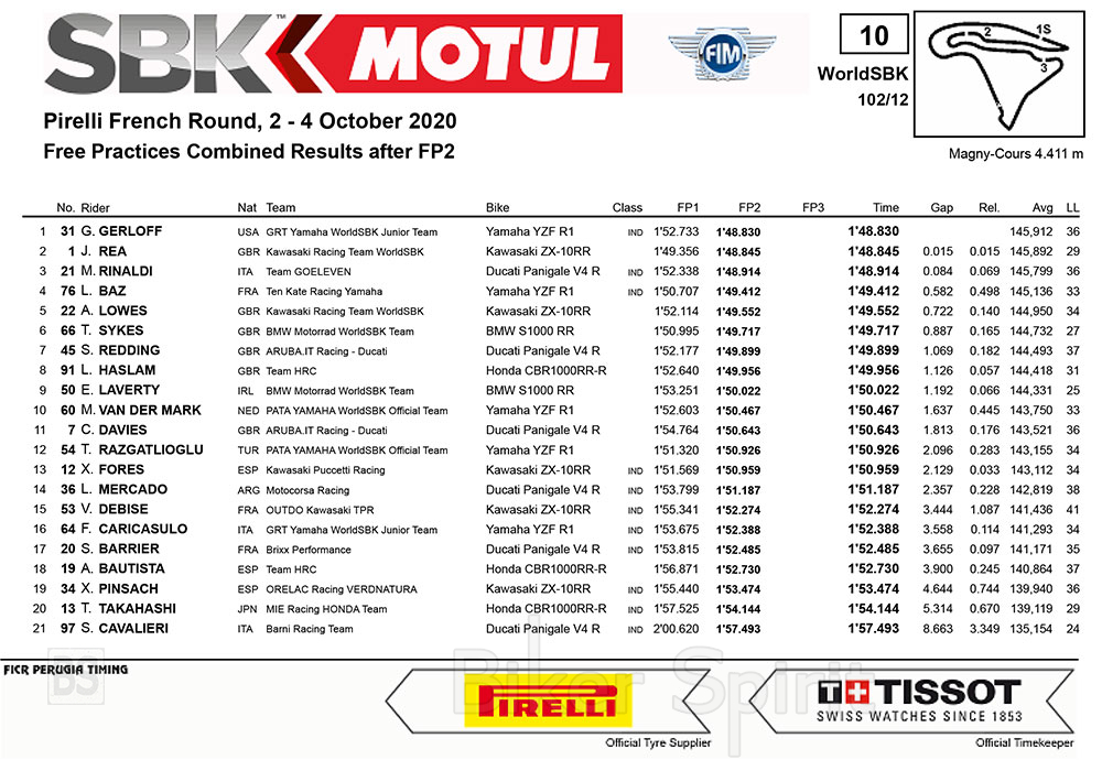 Οι δύσκολες υγρές συνθήκες καθ ‘όλη τη διάρκεια της 1ης ημέρας στο Magny-Cours, είχε αποτέλεσμα, τρεις από τους τέσσερις κορυφαίους αναβάτες να έχουν πτώσεις στο τέλος του Free Practice 2, με τον Garrett Gerloff (GRT Yamaha WorldSBK Junior Team) να βρίσκεται στην κορυφή της συνδυασμένης κατάταξης για τον Γαλλικό Γύρο Pirelli .