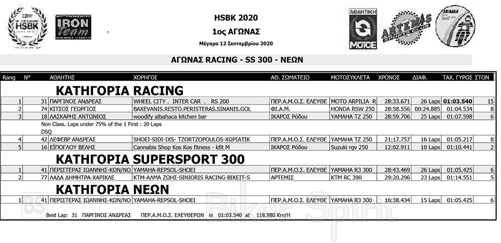 Τελικά στην 2η θέση τερμάτισε ο μικρός Γιάννης Περιστεράς, που συμμετείχε στην κατηγορία Νέων, αλλά και στη κατηγορία SS300, ενώ τρίτος τερμάτισε ο Γιώργος Κίτσος (2ο;στην κατηγορία του)
