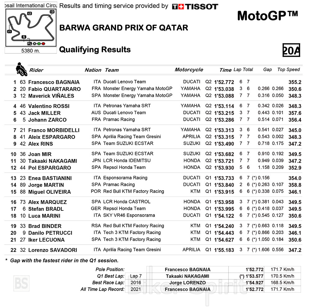 Φοβερή απόδοση για τον Valentino Rossi που τελικά έκανε τον 4ο χρόνο και θα ξεκινήσει από την δεύτερη σειρά, μπροστά από τον Jack Miller (εργοστασιακή Ducati) και τον Johann Zarco (Ducati Pramac).