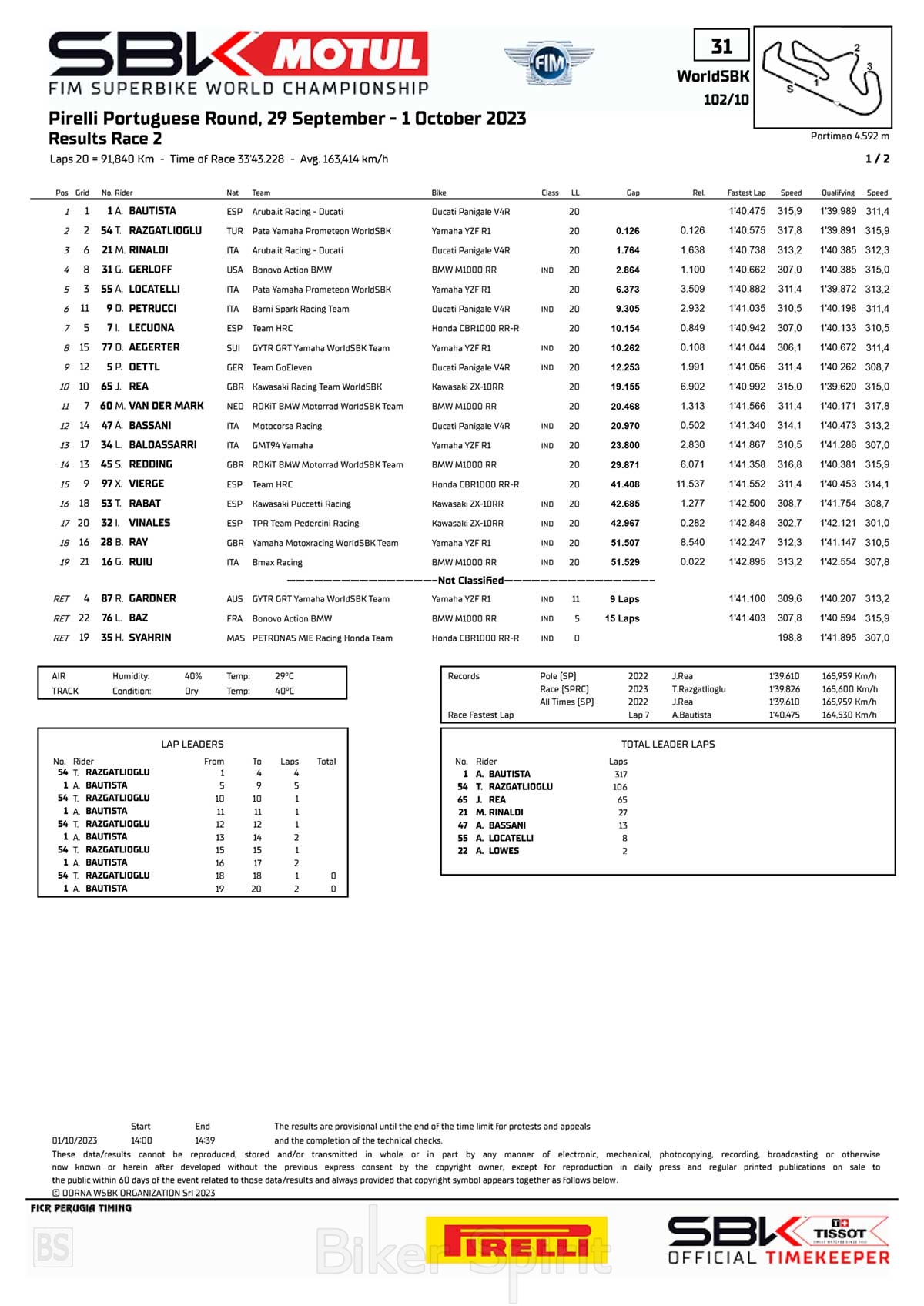 Ο Razgatlioglu ανέβηκε στο 113ο βάθρο του και στο 31ο της σεζόν, ενώ ο Ρινάλντι ανέβηκε στο 23ο βάθρο του .