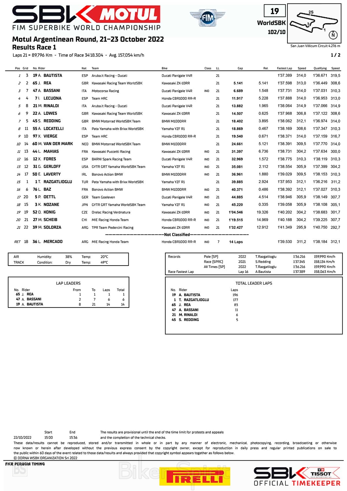 Ο ηγέτης του Πρωταθλήματος επέκτεινε το προβάδισμά του τόσο έναντι του Razgatlioglu όσο και του Rea μετά από έναν φοβερό 1ο αγώνα στην Αργεντινή, παίρνοντάς μια εμφατική νίκη στο Circuito San Juan Villicum, ενώ ο άμεσος αντίπαλος του, Toprak Razgatlioglu (Pata Yamaha Brixx WorldSBK) τερμάτισε στην 15η θέση αφού είχε μια πτώση στον 1ο γύρο στην προσπάθεια του να περάσει τον Bautista, που γλύτωσε την πτώση σαν από θαύμα!