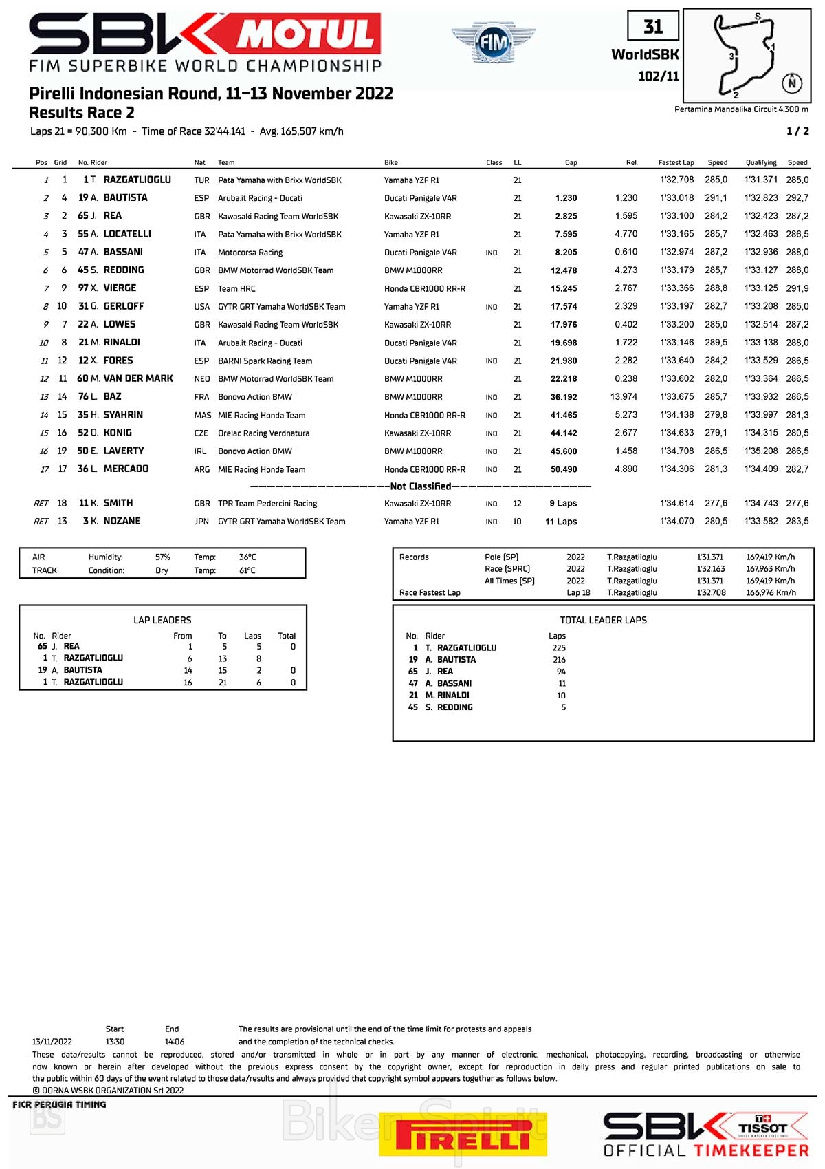 Η νίκη του Razgatlioglu του χάρισε την 32η νίκη του στο WorldSBK και την 14η της σεζόν και έτσι ισοφάρισε σε νίκες για μια σεζόν για τη Yamaha με τον Πρωταθλητή Ben Spies του 2009, ενώ η δεύτερη θέση του Bautista που κέρδισε το Πρωτάθλημα ήταν το 56ο βάθρο του στο WorldSBK , συμπεριλαμβανομένων των 29 της σεζόν 2022.