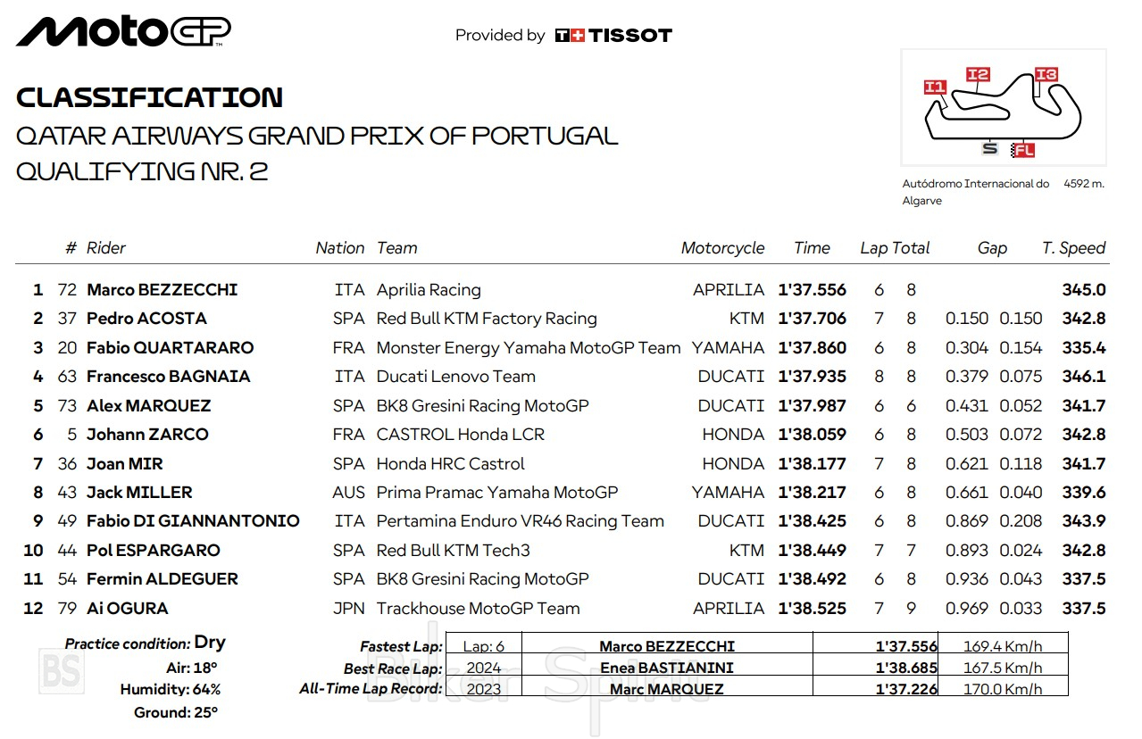 Ο Pol Espargaro ολοκλήρωσε τη δεκάδα, ενώ οι Fermin Aldeguer και Ai Ogura κατέλαβαν την ενδέκατη και δωδέκατη θέση αντίστοιχα, ολοκληρώνοντας τη σειρά των αναβατών που συμμετείχαν στο Q2.