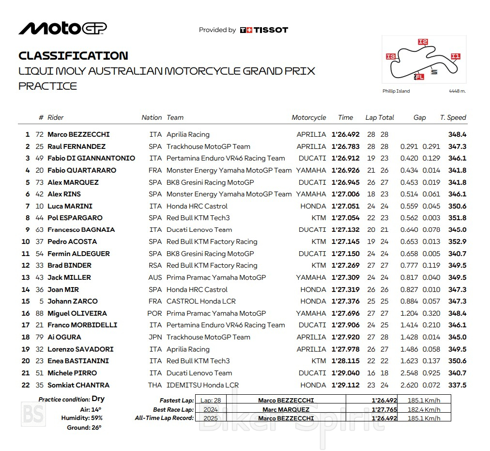 O Bezzecchi «σπάει τα χρονόμετρα» στο Practice στο Phillip Island– Ποιοί οδηγοί περνούν στο Q2 – Aποτελέσματα