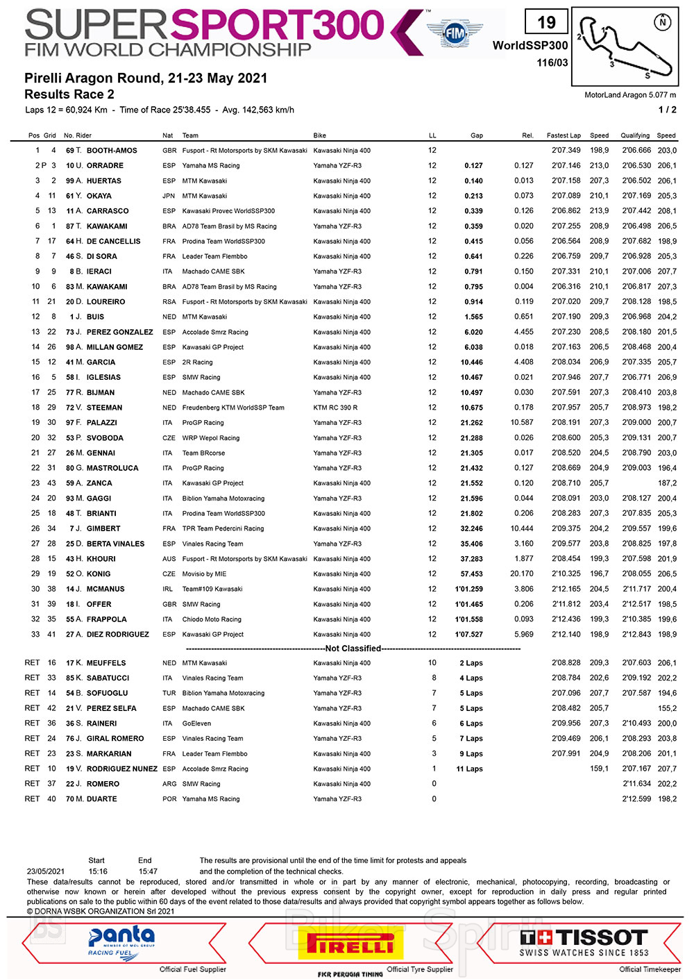 Στον 2ο συναρπαστικό αγώνα Supersport 300 στο MotorLand Aragon για τον γύρο Pirelli Aragon, νικητής ήταν ο Tom Booth-Amos (Fusports – RT Motorsports από την SKM Kawasaki) για την πρώτη νίκη του 2021