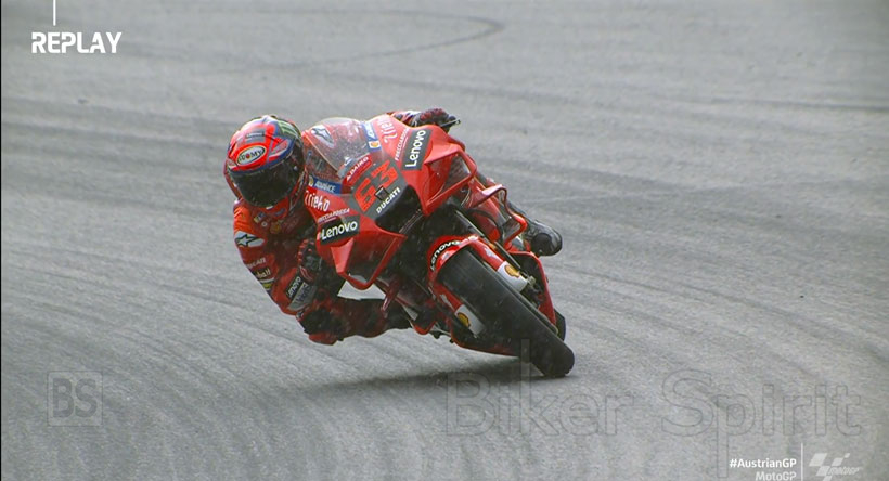 Ο Pecco επανήλθε στον αγώνα στην ενδέκατη θέση με το Desmosedici GP με βρόχινα ελαστικά και ρυθμίσεις και σύντομα πρόλαβε τους υπόλοιπους αναβάτες με slicks ελαστικά, προσπερνώντας τους και φτάνοντας στην τη δεύτερη θέση σε μόλις έναν γύρο για να πάρει το τέταρτο βάθρο της σεζόν. (Δηλώσεις του Bagnaia)