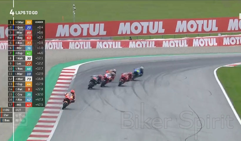 Ο οδηγός της ομάδας Red Bull KTM, βρέθηκε στην κορυφή του αγώνα τέσσερεις γύρους πριν το τέλος όταν ξεκίνησε δυνατή βροχή και ο επικεφαλής του αγώνα εκείνη την ώρα Marquez, μαζί με τον Bagnaia, Martin, Quartararo και Mir, μπήκαν να αλλάξουν μοτοσυκλέτα με βρόχινα ελαστικά!