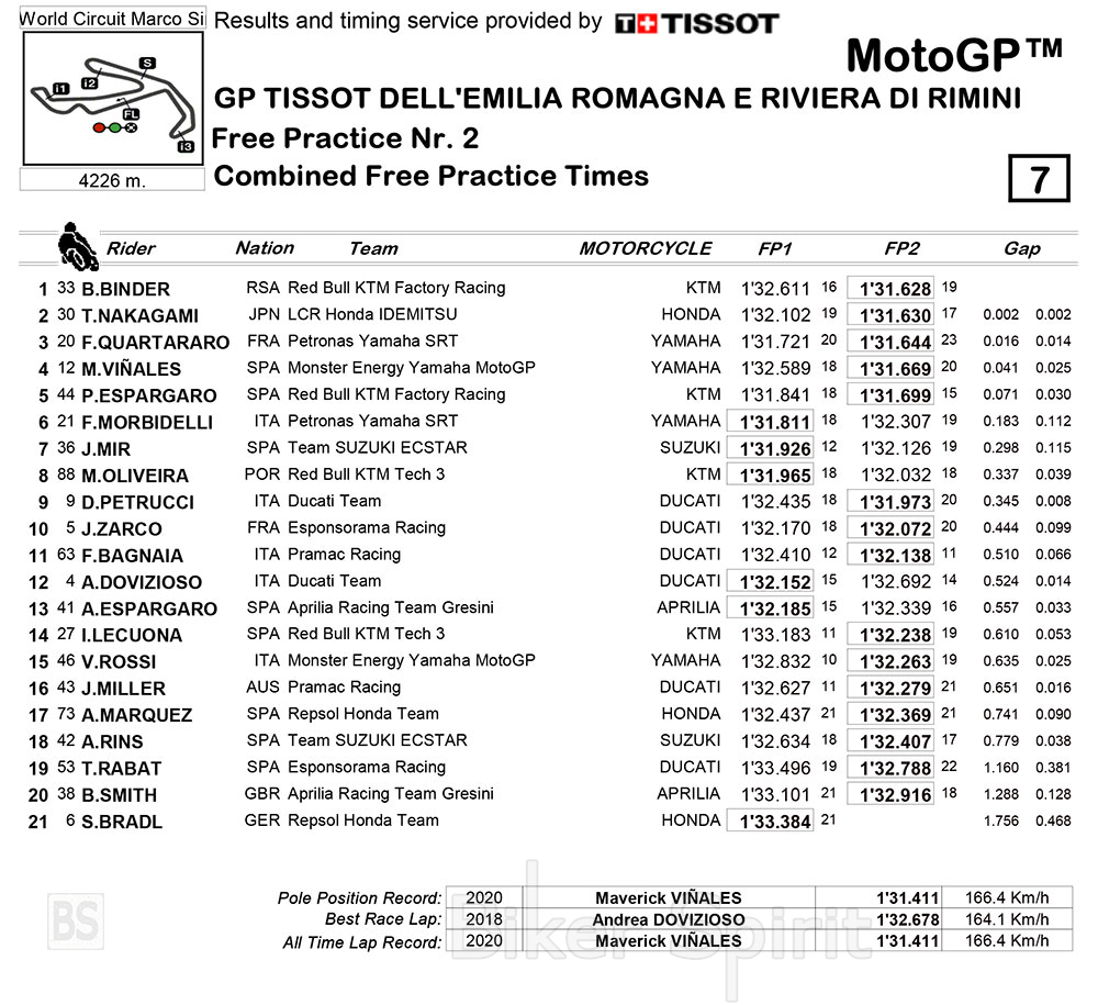 Ο Fabio Quartararo (Yamaha Petronas) που ήταν ο ταχύτερος στο FP1, ήταν τρίτος στο FP2 και της ημέρας συνολικά μόλις 16 χιλιοστά (0.016 ) από την κορυφή και 25 χιλιοστά μπροστά από τον φίλο του, και τον επόμενο συμπαίκτη του, Maverick Vinales.