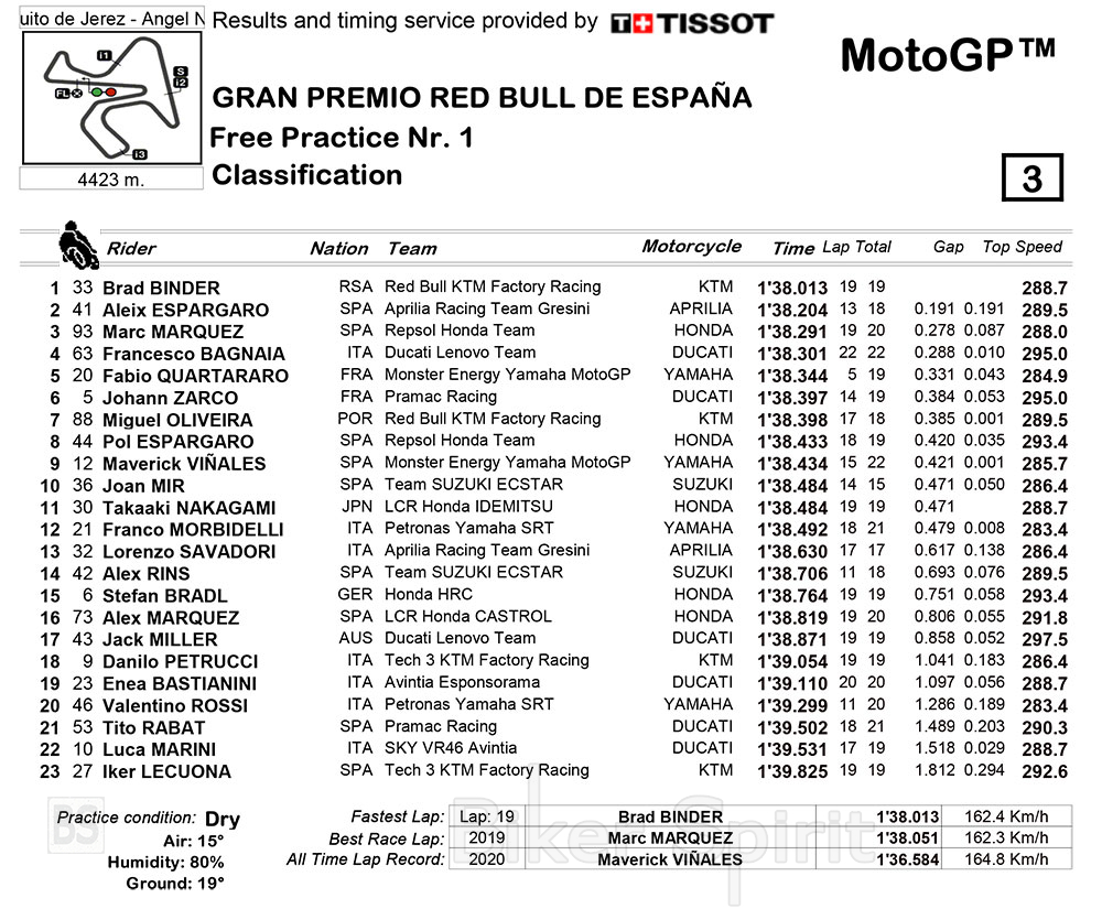 Στο τέλος της περιόδου, ο αναβάτης της KTM σταμάτησε το χρονόμετρο στο 1:38.013, ένας χρόνος που ήταν ο ταχύτερος, μπροστά από το Aprilia του Aleix Espargarò, με μόλις 0.191 δευτερόλεπτα διαφορά, και όπου ήταν για μεγάλο χρονικό διάστημα στη κορυφή του FP1.