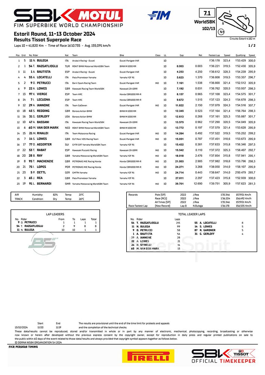 Σε ένα συναρπαστικό σπριντ μέχρι τον τερματισμό, ο Bulega πήρε την νίκη του αγώνα Superpole πάνω στην γραμμή τερματισμού με διαφορά 0,003 δευτερόλεπτα μπροστά από τον Razgatlioglu, που είναι η μικρότερη διαφορά για νίκη στην ιστορία του Superbike