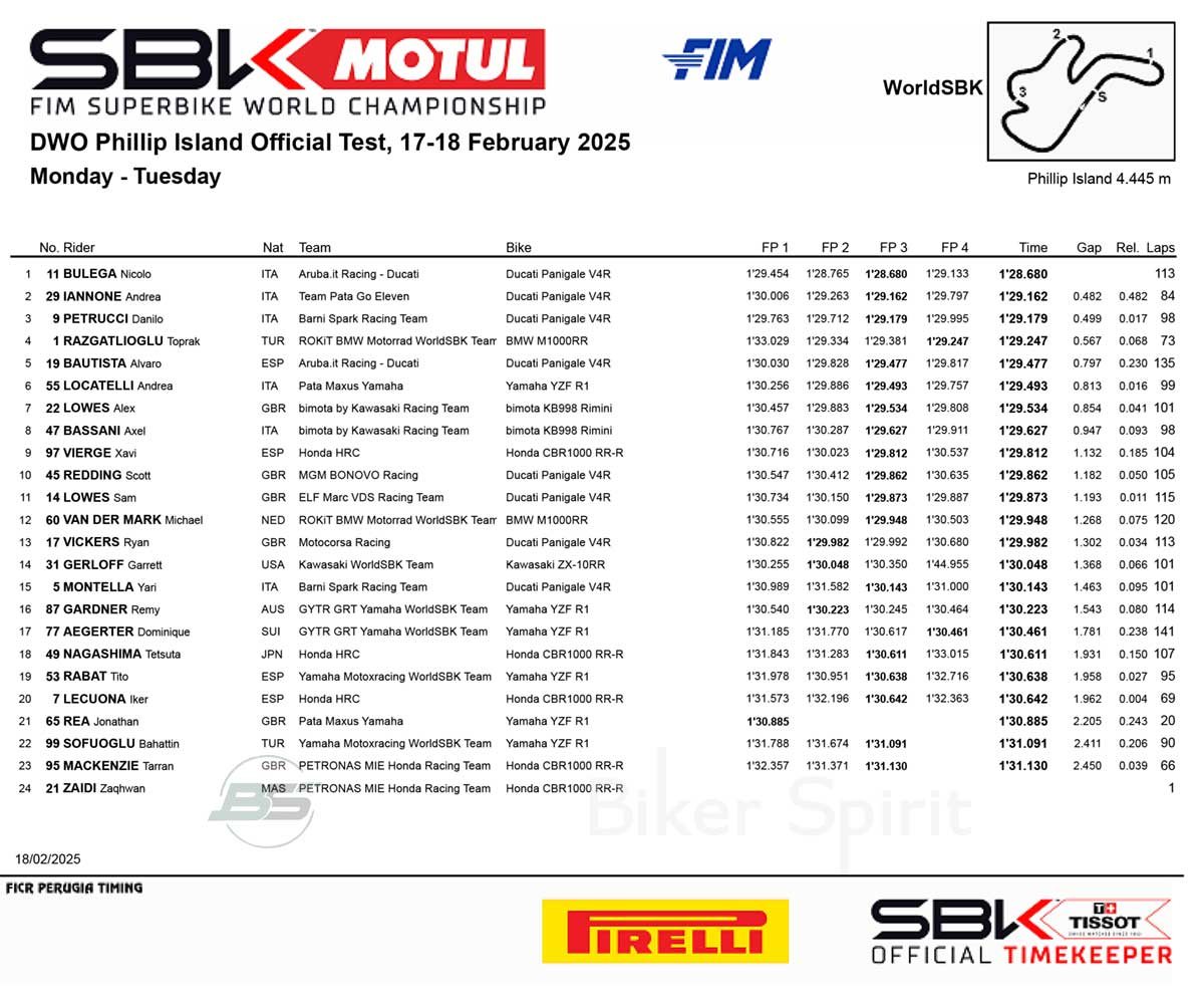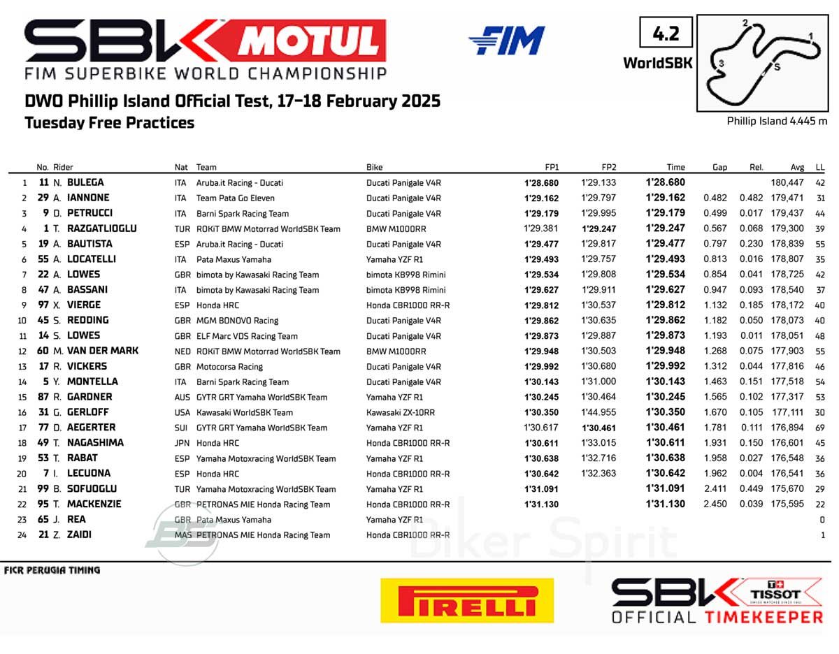 Τέταρτος χρόνος για την BMW του Παγκόσμιου Πρωταθλητή Toprak Razgatlioglu, ο οποίος προηγείται της δεύτερης επίσημης Ducati, αυτής του Ισπανού Alvaro Bautista, ο οποίος, με την Panigale V4 R, είχε διαφορά από τον πρώτο +0.797.