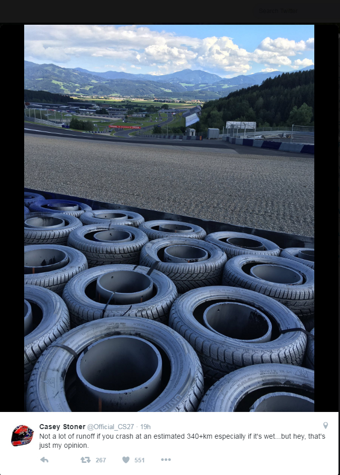 Λίγες ώρες πριν την έναρξη των επίσημων δοκιμών στην νέα πίστα του Red Bull Ring στην Αυστρία, ο Casey Stoner θέτει θέματα ασφάλειας με ανάρτηση του στα μέσα κοινωνικής δικτύωσης.