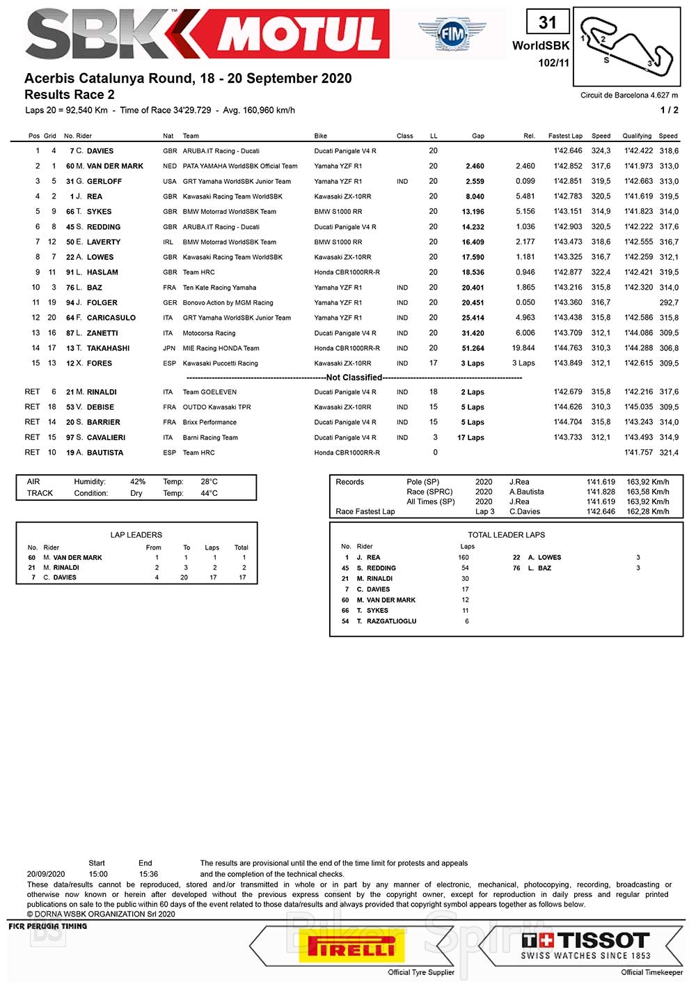 Ο 2ος αγώνας 2 Superbike World Championship στην Catalunya, ήταν συναρπαστικός καθώς ο Chaz Davies (ARUBA.IT Racing – Ducati) διεκδίκησε την πρώτη του νίκη στη σεζόν 2020 και έγινε ο έβδομος διαφορετικός νικητής το 2020