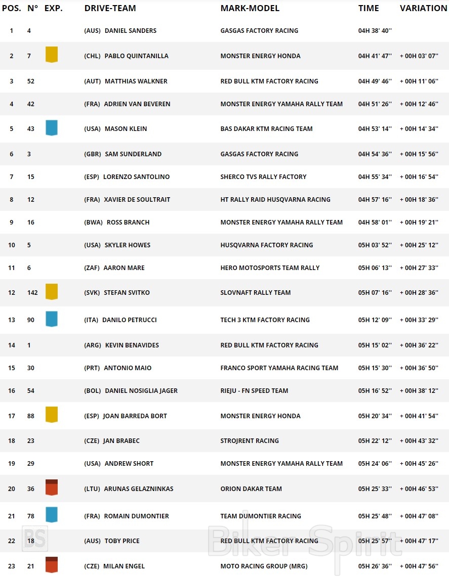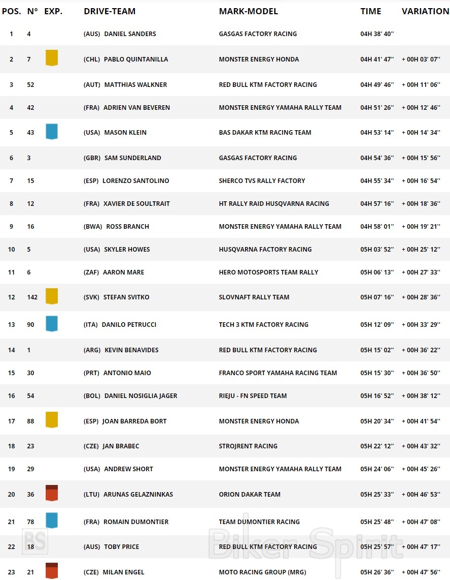 Ο Rookie Mason Klein τερμάτισε εντυπωσιακός τέταρτος, μόλις 14 δευτερόλεπτα μακριά από τον ρυθμό του Walkner, με τον Lorenzo Santolino να έχει εξίσου δυνατές επιδόσεις με την Sherco TVS για να φτάσει στην πέμπτη θέση.