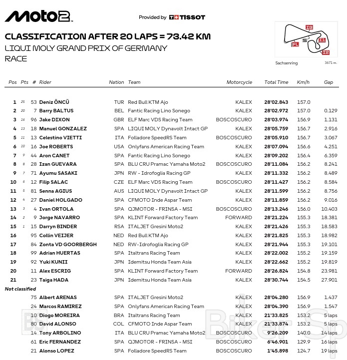 Ο Deniz Oncu ήταν κυρίαρχος στο μεγαλύτερο μέρος της διαδρομής και κράτησε την πρωτοπορία μέχρι τη στιγμή της διακοπής, εξασφαλίζοντας έτσι την νίκη στο Γερμανικό GP.