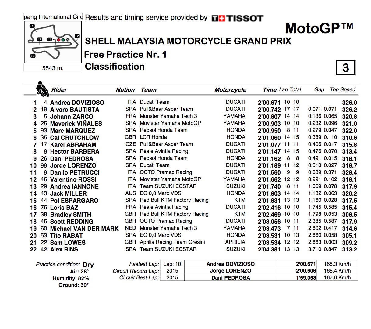 Ο Danilo Petrucci ήταν ενδέκατος μπροστά από τον συμπατριώτη του Valentino Rossi, με τους Andrea Iannone, Jack Miller και Pol Espargaro να κλείνουν την δεκαπεντάδα.