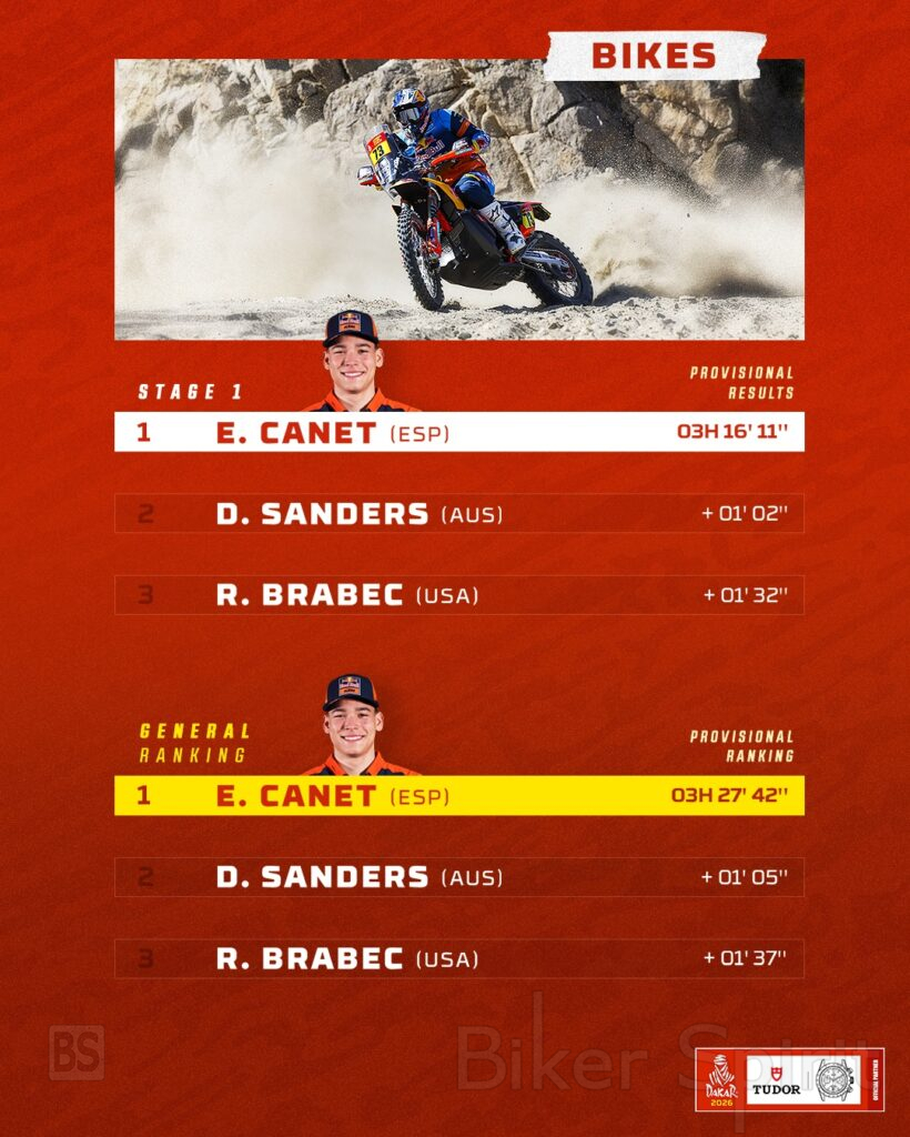 Έτσι, ο μεγάλος πρωταγωνιστής της ημέρας αναδείχθηκε ο Edgar Canet. Στο ντεμπούτο του στη RallyGP και ως εν ενεργεία πρωταθλητής Rally2, ο Ισπανός πήρε τη νίκη της Ειδικής 1, μπροστά από τον Daniel Sanders (+1:02) και τον Ricky Brabec (+1:32). Ένα αποτέλεσμα που επιβεβαιώνει ότι η νίκη του στον πρόλογο μόνο τυχαία δεν ήταν και που τον τοποθετεί από νωρίς σε ρόλο πρωταγωνιστή στη γενική.