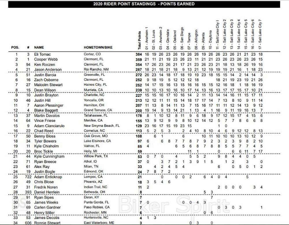 Με 12 βάθρα, 7 νίκες, 3 δεύτερες θέσεις και δυο τρίτες θέσεις στους 17 αγώνες, ο Eli Tomac έφτασε στους 384 βαθμούς, στην κορυφή της βαθμολογίας, με τον Cooper Webb, συγκέντρωσε 359 βαθμούς στην δεύτερη θέση και τον Ken Roczen στην τρίτη θέση με 354 βαθμούς!