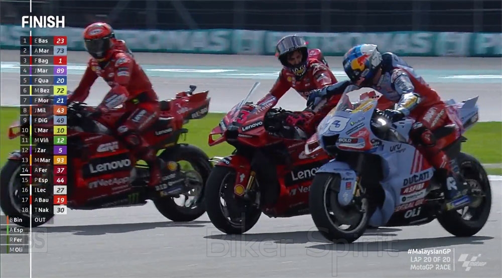 Στην 3η θέση κλείνοντας το βάθρο τερμάτισε ο Pecco Bagnaia που ξεκίνησε από την pole, αλλα χωρίς να καταφέρει να στρίψει πρώτος και έτσι έμεινε στην 3η θέση, οπού εκτός από μια πίεση από τον Jorge Martin που δέχτηκε στην αρχή, αποκρούοντας τις επιθέσεις του, συνέχισε σε έναν μοναχικό αγώνα, φεύγοντας από την Μαλαισία μεγαλώνοντας την διαφορά του στην βαθμολογία στους 14 βαθμούς από τον δεύτερο Martin που τερμάτισε στην 4η θέση, χωρίς να μπορέσει να παλέψει για το βάθρο κάνοντας και αυτός έναν μοναχικό αγώνα στην 4η θέση, με σχεδόν 7 δευτερόλεπτα διαφορά από τον Bagnaia!