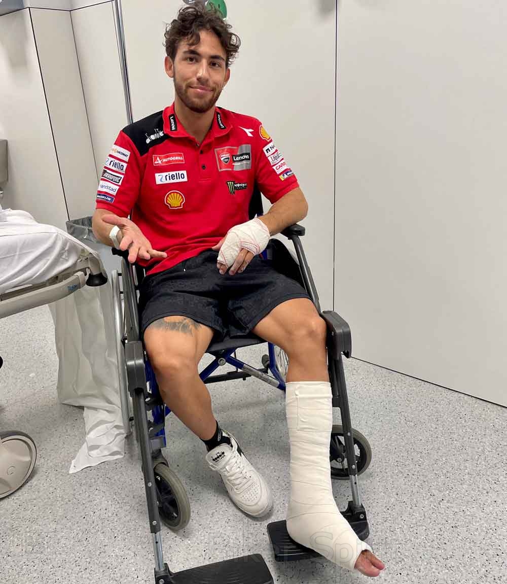 Ενημέρωση από την Ducati: «Ο Bastianini έχει ένα μη μετατοπισμένο κάταγμα του έσω σφυρού του αριστερού αστραγάλου (“malleolus medialis”), και ένα κάταγμα στο δεύτερο μετακάρπιο του αριστερού χεριού. Χέρι και αστράγαλος έχουν δεθεί – ακινητοποιηθεί για να τον αφήσουν να ταξιδέψει στην Ιταλία απόψε. Θα χρειαστεί χειρουργική επέμβαση και στους δύο τραυματισμούς»