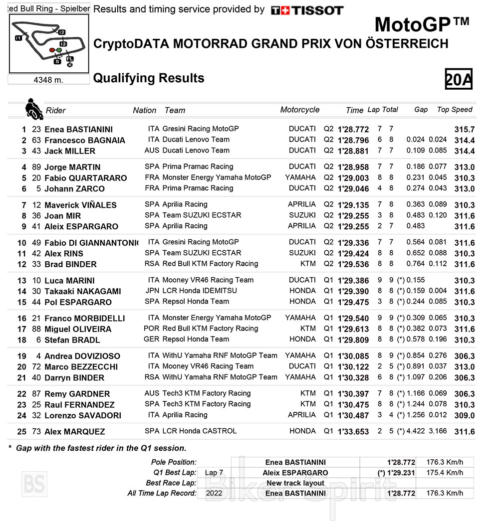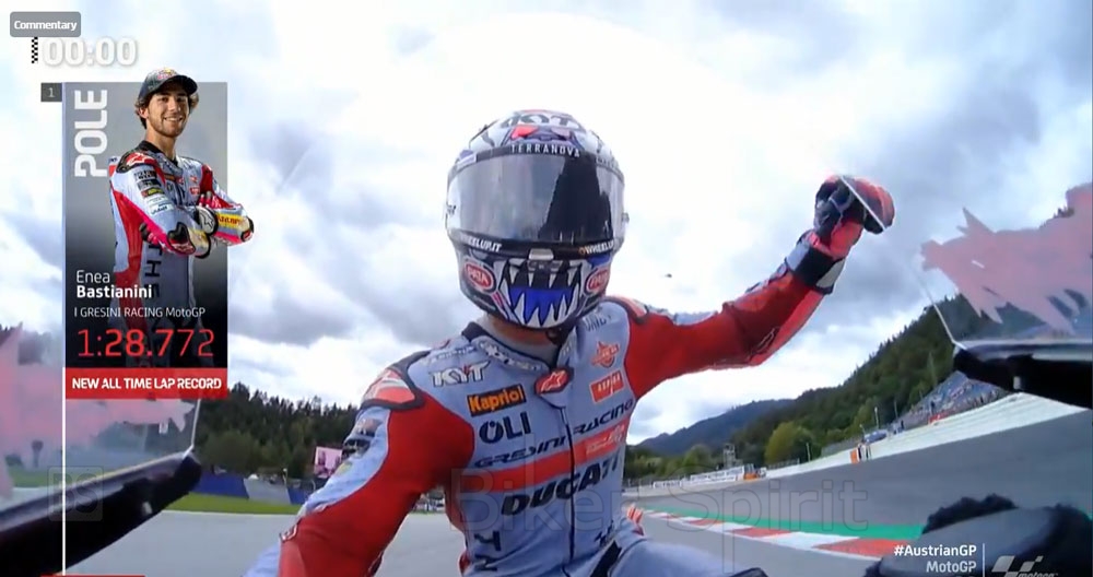 Ο Enea Bastianini κέρδισε την Pole Position στο Red Bull Ring στην Αυστρία, με χρόνο 1.28.772 που έκανε στον τελευταίο του γύρο και που αποτελεί τον νέο ρεκόρ της πίστας μετά την προσθήκη του νέου σικέην!