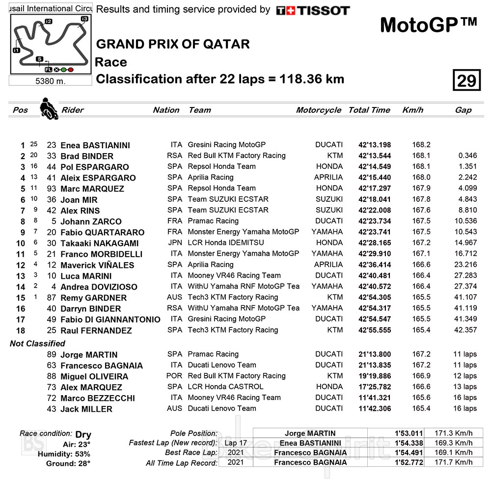 Να σημειώσουμε ότι σήμερα στο Κατάρ είχαμε Ιταλικό χατ-τρικ με νίκες Ιταλών στη Moto3, Moto2 και MotoGP.