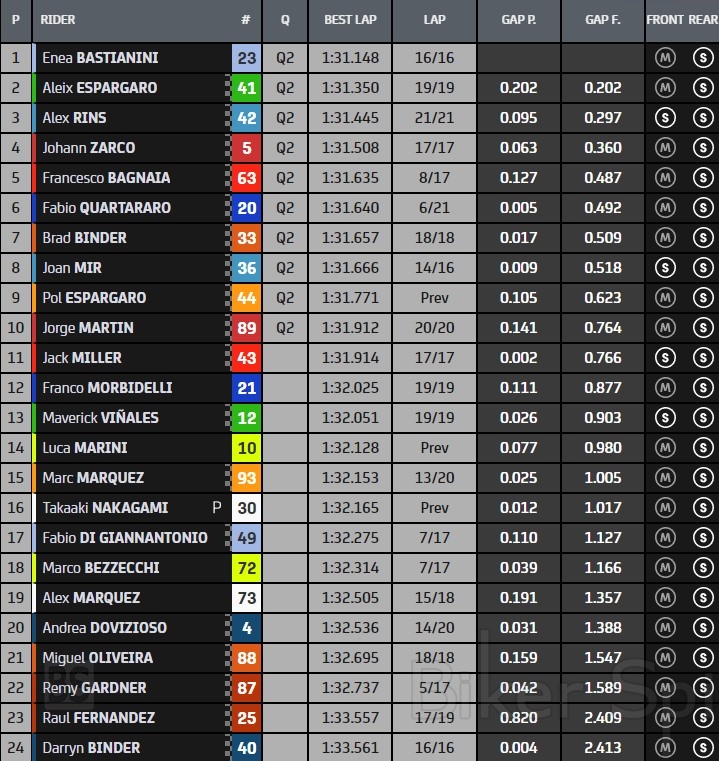 Στην 11η θέση ο Jack Miller, που είχε πτώση, μπροστά από τον Franco Morbidelli, που είχε επίσης πτώση, τον Maverick Vinales, τον Luca Marini, που είχε επίσης πτώση, και τον Marc Marquez που συμπληρώνει την 15αδα, ενώ στον τελευταίο γρήγορο γύρο είχε και παλι ένα γλίστρημα και έκανε και παλι ένα θεαματικό σώσιμο!
