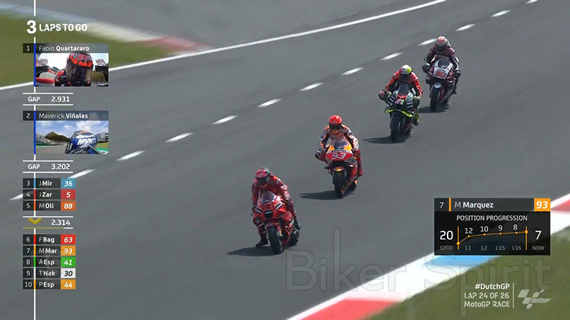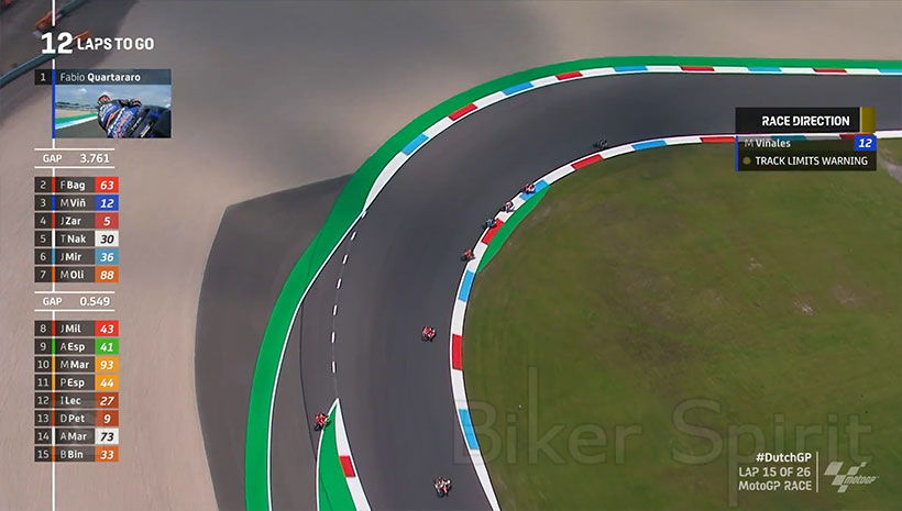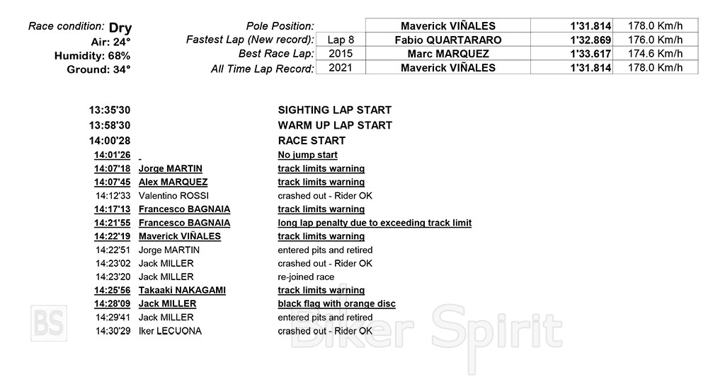 Ο Fabio Quartarar μετά από μια μάχη για αρκετούς γύρους στην αρχή με τον «Pecco» Bagnaia (Ducati), κατάφερε και ξέφυγε και έκανε μια καλή διαφορά απο τους υπόλοιπους.