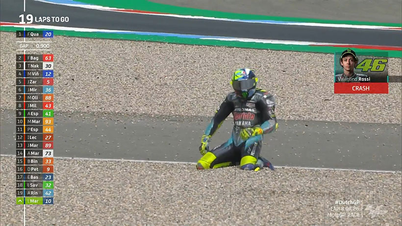 Ενας αγώνας για να ξεχάσει ήταν για τον Valentino Rossi ο οποίος, μετά από μια κακή εκκίνηση από τη 12η θέση, βρέθηκε προτελευταίος στην πρώτη στροφή και αργότερα έπεσε με μεγάλη ταχύτητα στη στροφή 7, ευτυχώς χωρίς συνέπειες αλλά εγκατέλειψε τον αγώνα.