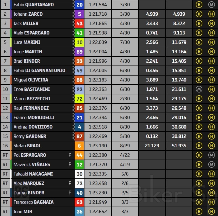 Αγώνα για να τον ξεχάσουν είχαν ο Pecco Bagnaia που είχε πτώση ενώ ήταν δεύτερος και πολύ κοντά στον Quartararo, αφού έχασε το πίσω μέρος της μοτοσυκλέτας, ενώ ο Maverick Vinales πάλευε για το βάθρο όταν μια μηχανική βλάβη τον ανάγκασε να εγκαταλείψει τον αγώνα απογοητευμένος.