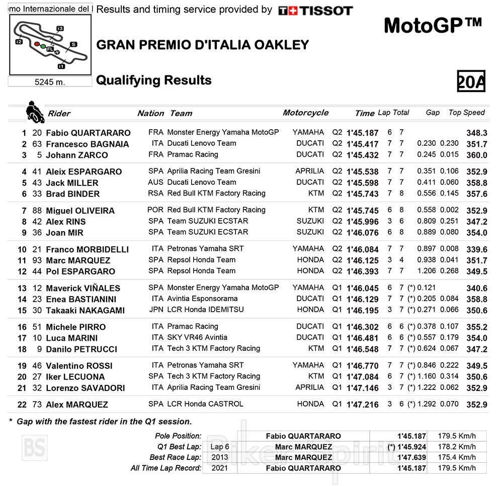 Ο Γάλλος αναβάτης της Yamaha, κέρδισε την τέταρτη συνεχόμενη pole της σεζόν, σπάζοντας τα χρονόμετρα και το σταμάτησε στο 1:45.187 και περνώντας 0.223 μπροστά από τον Pecco Bagnaia που είχε κάνει ρεκόρ στο FP3 ! Ο Quartararo κέρδισε την 14η pole στο MotoGP, και την πρώτη στο Mugello!